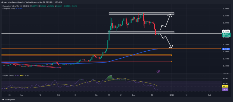 على الجانب الإيجابي، يبلغ مؤشر القوة النسبية (RSI) لـ DOGE حاليًا عند 37.85 مما يشير إلى وجود احتمال قوي للزخم الصعودي في الأيام المقبلة.