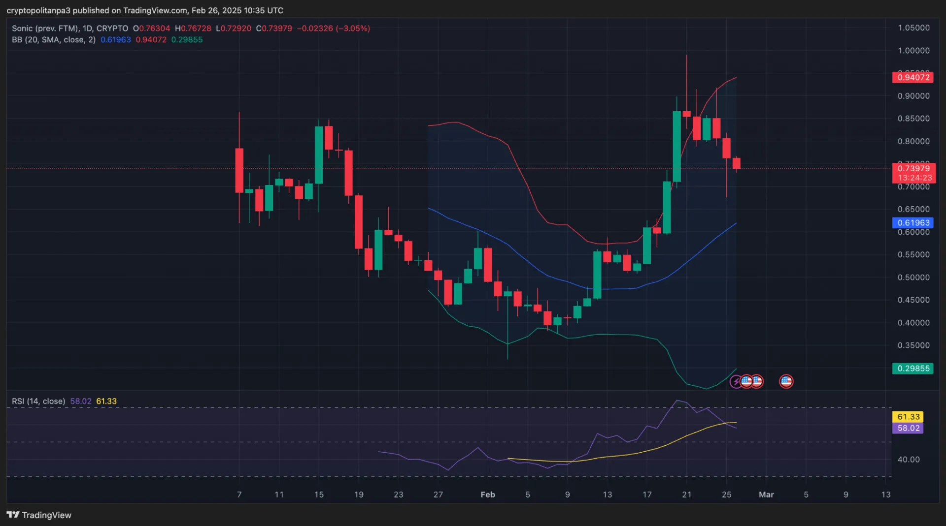 لقد شهدت Sonic Price مؤخرًا راليtronG ، ولكن يبدو أن التصحيح جاري. يقع السعر حاليًا بالقرب من 0.739 دولار ، حيث تعرض نطاقات Bollinger انسحاب بعد لمس النطاق العلوي حوالي 0.94 دولار.