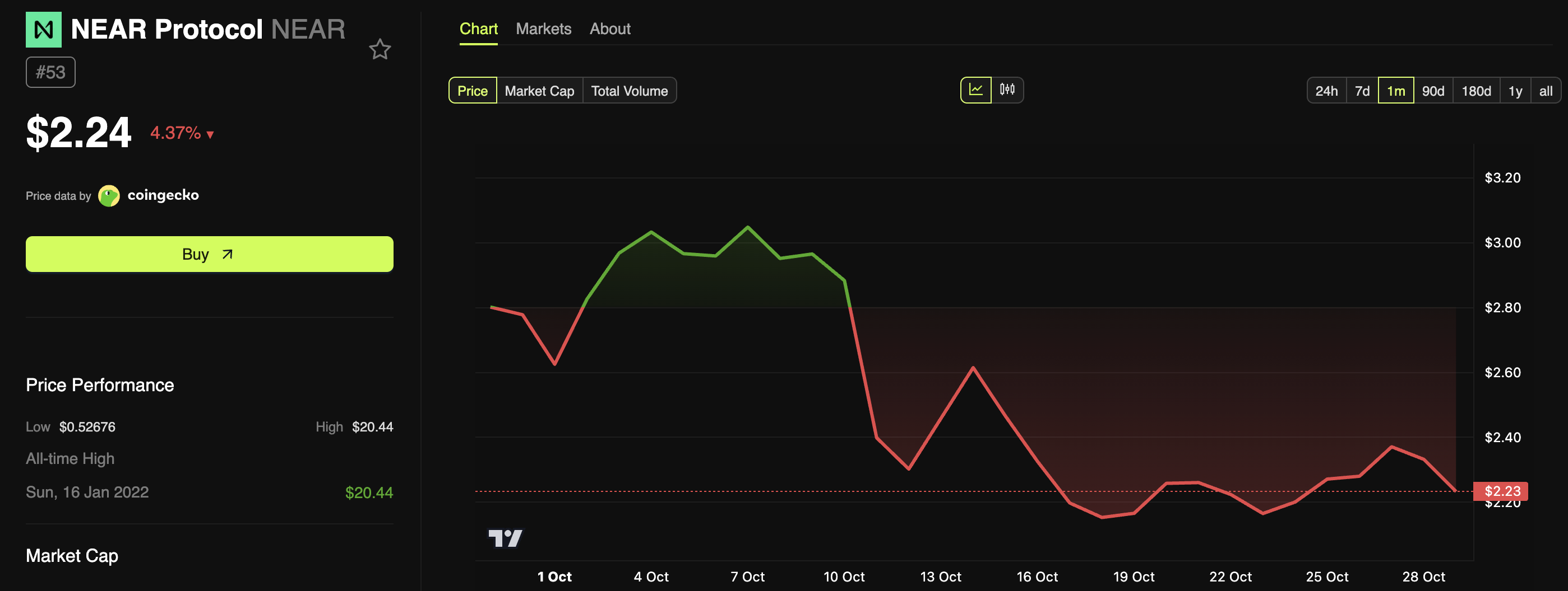 انخفض أيضًا الرمز الأصلي لـ NEAR Protocol بجانب سهم OceanPal. وفقًا لبيانات BeInCrypto Markets، تم تداول NEAR عند 2,24 دولار وقت النشر، مما يظهر خسارة بنسبة 4,37% خلال الـ 24 ساعة الماضية وانخفاض بنسبة 20,7% خلال الشهر.