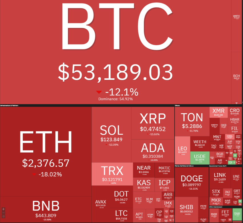 شهدت أسواق العملات الرقمية المشفرة تراجعًا حادًا و غرقت في اللون الأحمر. حيث انخفض سعر البيتكوين إلى 49 ألف دولار. وكان سعر الإيثيريوم $ETH من أكبر الخسارين. حيث تراجع إلى ما دون مستوياته في بداية العام 2024.