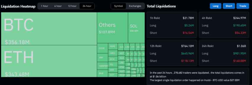 تأثر الإيثيريوم $ETH بشكل كبير بهذه التصفية، حيث تم تصفية رهانات بقيمة تزيد عن 340 مليون دولار. بينما كانت خسائر العقود الآجلة للبيتكوين الأكبر بقيمة 420 مليون دولار. وتضرر أكثر من 275 ألف متداول فردي من هذه التصفية، وكان أكبر طلب تصفية واحد على منصة Huobi لتداول العملات الرقمية بقيمة 27 مليون دولار في زوج $BTC/USD حسب بيانات CoinGlass.