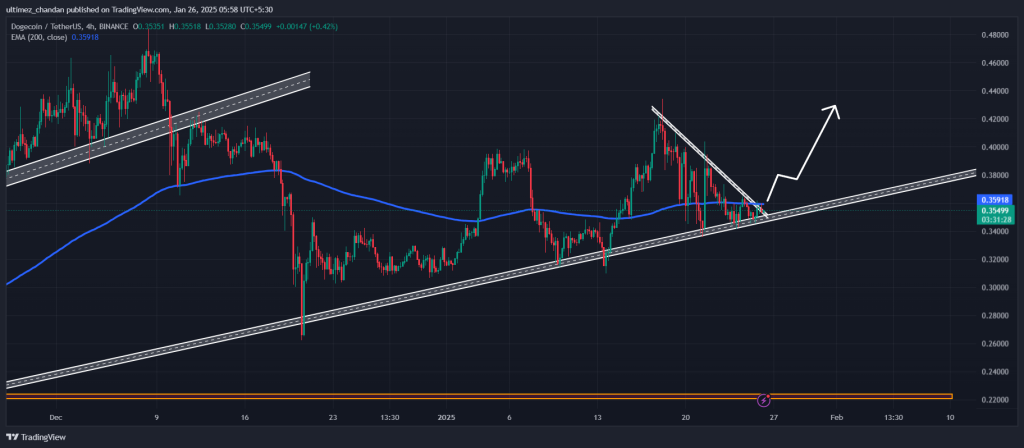 وفقًا للتحليل الفني، يبدو أن سعر DOGE صعودي، حيث إنه حاليًا عند مستوى دعم حاسم يوفره خط الاتجاه وهو أيضًا على استعداد لاختراق خط الاتجاه المائل على الإطار الزمني لأربع ساعات. منذ ديسمبر 2024، حصل DOGE على الدعم من خط الاتجاه هذا أربع مرات، وفي كل مرة، شهد زخمًا صعوديًا مثيرًا للإعجاب.