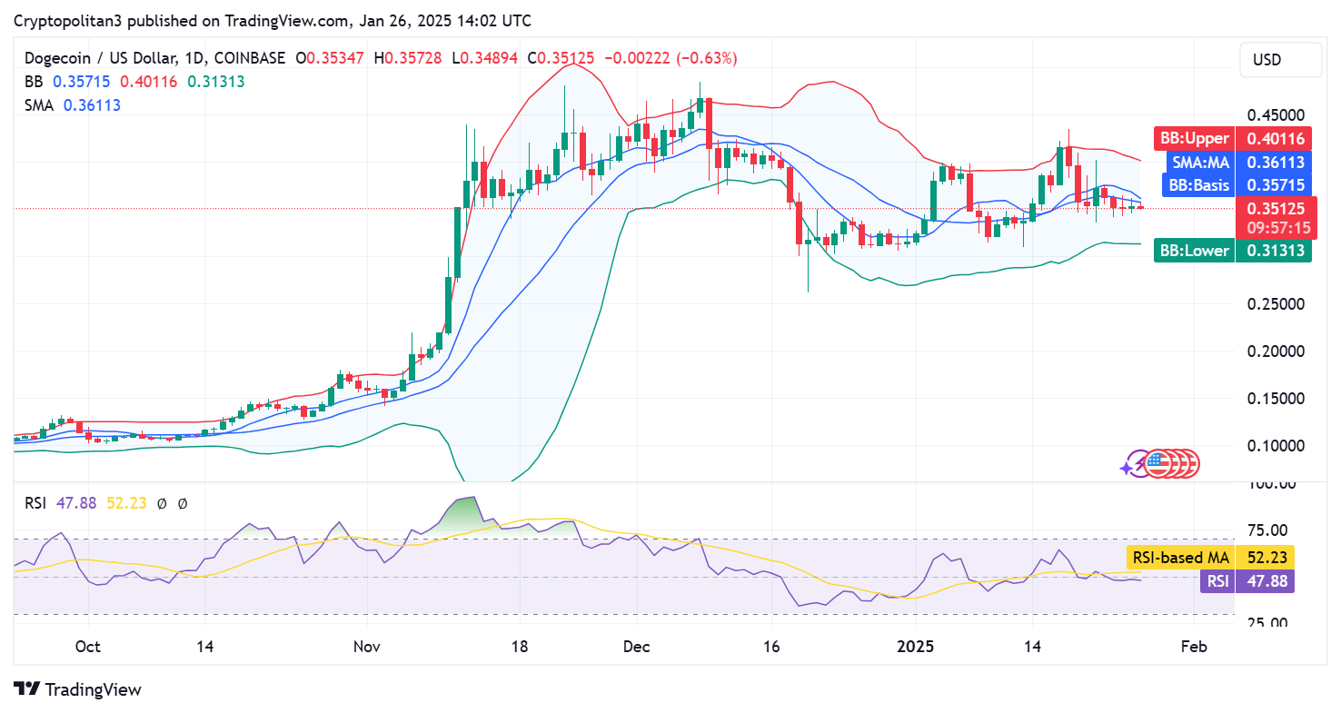في 26 يناير 2025، كشف تحليل سعر Dogecoin عن اتجاه هبوطي للعملة. انخفضت قيمة العملة إلى أدنى مستوى عند 0.351 دولار خلال الـ 24 ساعة الماضية. ومع ذلك، على الجانب الآخر، ارتفعت العملة المشفرة بنسبة تصل إلى 0.22 بالمائة. لذلك، لا تزال معنويات السوق بشكل عام صعودية، في حين ارتفع ضغط البيع خلال اليوم.