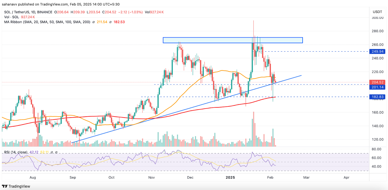 بعد الانخفاض الأخير، انخفض سعر $SOL ووصل إلى خط الاتجاه الصاعد، والذي كان بمثابة دعم قوي منذ سبتمبر 2024. على الرغم من أن المراهنين على الارتفاع تمكنوا من الدفاع عن الدعم، إلا أن المؤشرات الفنية تشير إلى أن تصحيحا أعمق يقترب بسرعة.