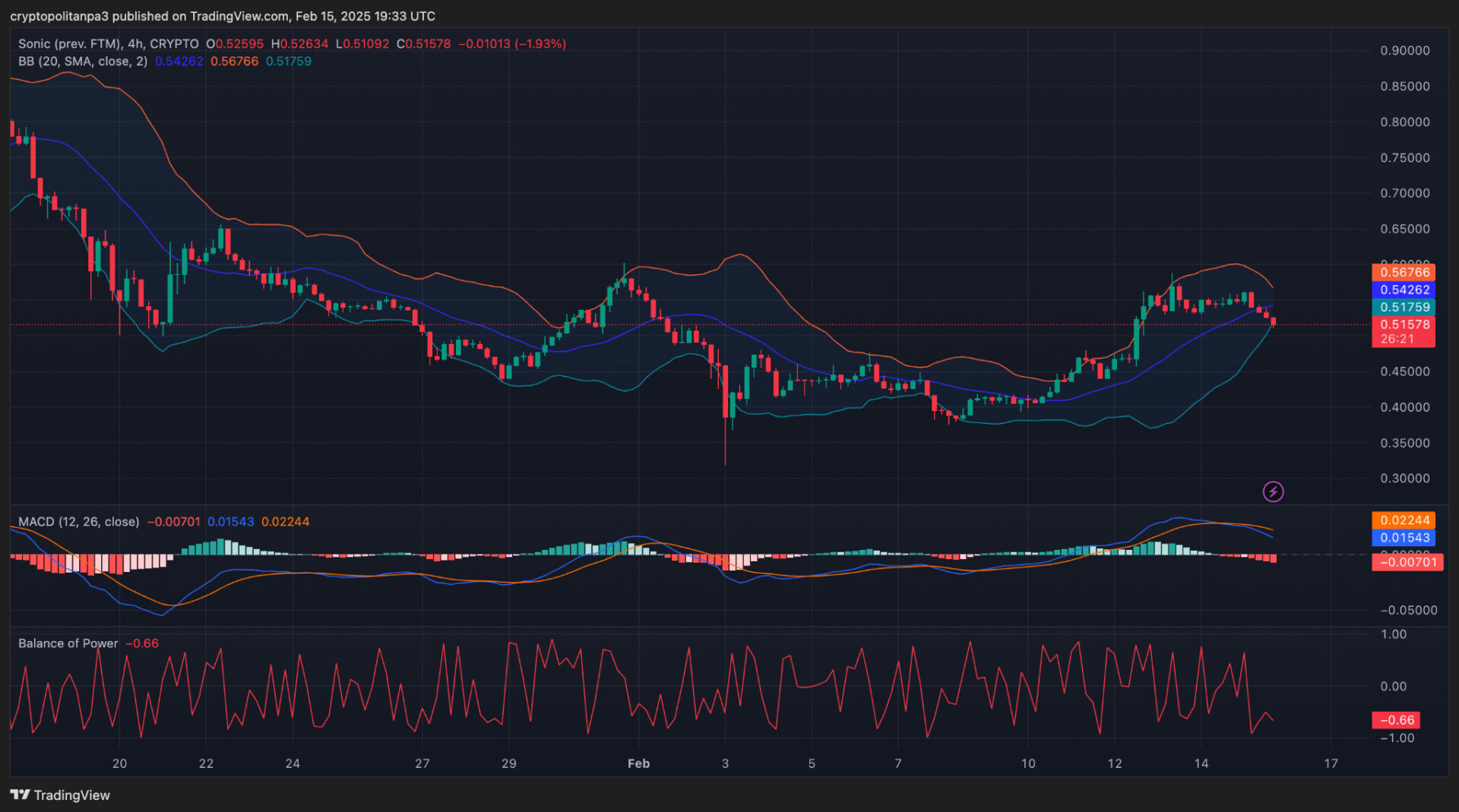على الرسم البياني لمدة 4 ساعات ، يشير MACD إلى انخفاض في الزخم الصعودي ، في حين يشير توازن الطاقة (-0.66) إلى السيطرة على البائعين. إذا فشلت Sonic في الحصول على 0.50 دولار ، فمن المحتمل أن يكون الجانب السلبي نحو 0.47 دولار. استراحة فوق 0.54 دولار يمكن أن تؤدي إلى انعكاس صعودي.