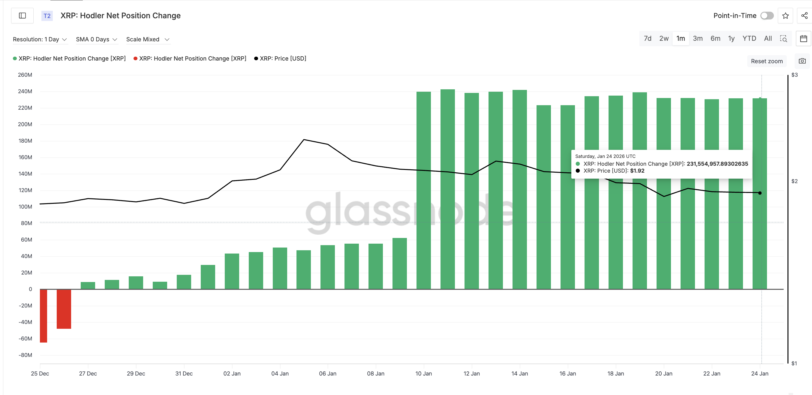 مؤشر تغيير المركز الصافي ل XRP Hodler، الذي يتتبع تغير الرصيد الشهري لأصحاب المراكز طويلة الأجل، قد استقر وبدأ في الانخفاض. في 20 يناير، كان الحاملون على المدى الطويل يسيطرون على حوالي 232.1 مليون XRP. وبحلول 24 يناير، انخفض هذا الرقم إلى حوالي 231.55 مليون XRP.