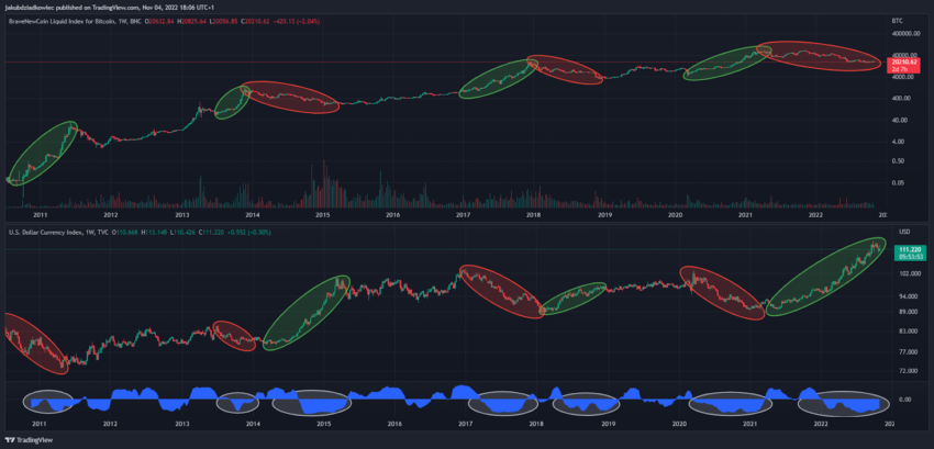 وثمة علاقة سلبية بين أسهم التكنولوجيا ومؤشر الدولار الأمريكي نتيجة للعلاقة العكسية بينهما، وترتبط جميع الأسواق الصاعدة للأصل المشفر بالانخفاضات في مؤشر الدولار كما يتزامن هبوط البتكوين مع الزيادات في مؤشر الدولار بما يؤكد وجود علاقة عكسية قوية من خلال معامل الارتباط في الجزء السفلي من الرسم البياني، وخلال فترات الاتجاهات القوية ثمة ارتباط سلبي يمثل مناطق رمادية.