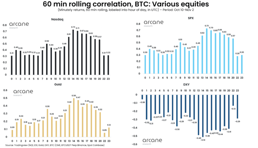 وأشار المستخدم VetleLunde إلى هذا الأمر في الفترة الأخيرة الذي غرّد ببيانات في شهر أكتوبر ترصد العلاقة بين البتكوين ومؤشر SPX وناسداك والذهب ونتج عن هذه البيانات أن الأسواق أكثر ارتباطاً خلال ساعات التداول في الولايات المتحدة إضافة إلى الارتباط بالتضخم، لذا ينظر المستثمرين في أميركا إلى البتكوين كأصل مشفر لا يحتوي على مخاطر أكثر من كونه وسيلة للتحوط ضد التضخم.