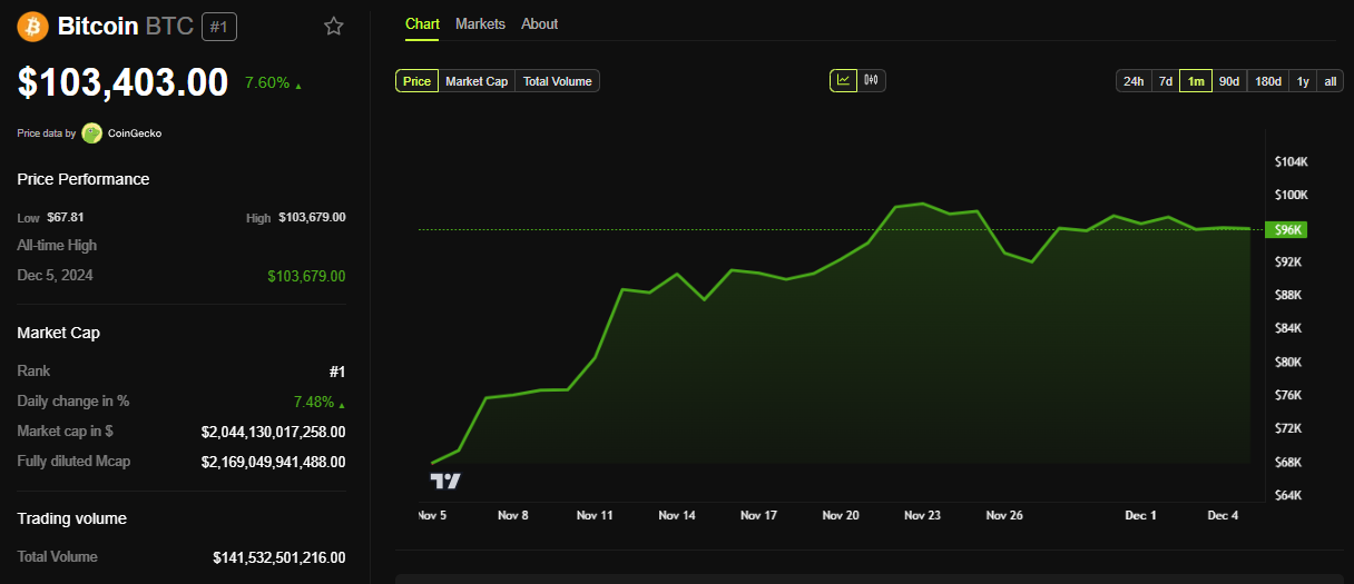 تشير هذه التطورات مجتمعة إلى أن المؤسسات المالية والهيئات الحكومية تدرك إمكانات الأصول الرقمية وأهميتها في تحويل الاقتصاد الوطني. بناءً على بيانات BeInCrypto، يتم تداول BTC بسعر 103,403 دولار في وقت كتابة هذا التقرير، مما يمثل زيادة بنسبة 7,6% منذ افتتاح جلسة الخميس.