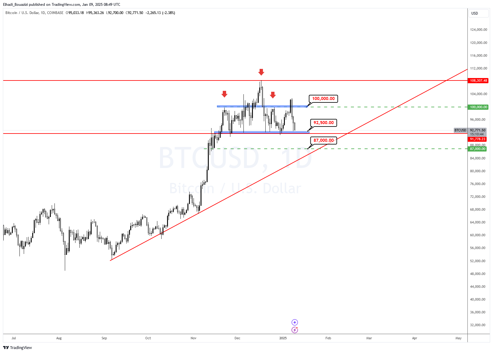 سعر البيتكوين BTC يتداول حاليا أعلى قليلا من مستوى منطقة الدعم القوي في حدود 92,500 دولار. التي ارتد منها خمس مرات في الأسابيع الماضية.