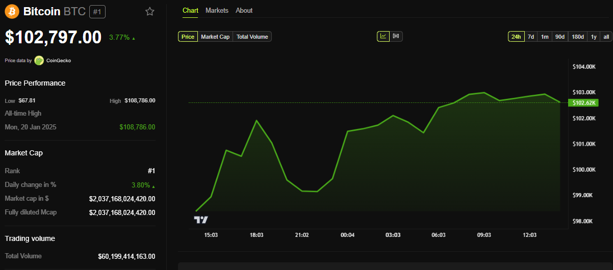 تظهر بيانات BeInCrypto أن BTC كان يتداول عند 102,797 دولار في وقت كتابة هذا التقرير. وهذا يمثل ارتفاعًا بنسبة 3,77% منذ افتتاح جلسة الثلاثاء.