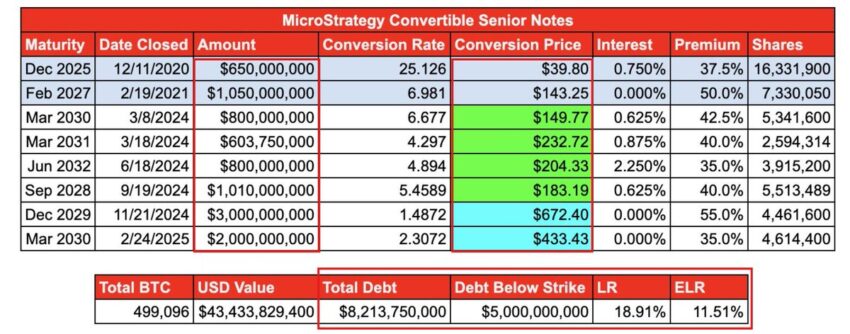 وفقًا لأحدث البيانات، تمتلك ستراتيجي حوالي $43,4 مليار في بيتكوين مقابل $8,2 مليار في الديون. وبالتالي، فإن نسبة الرافعة المالية لديها حوالي 19%.