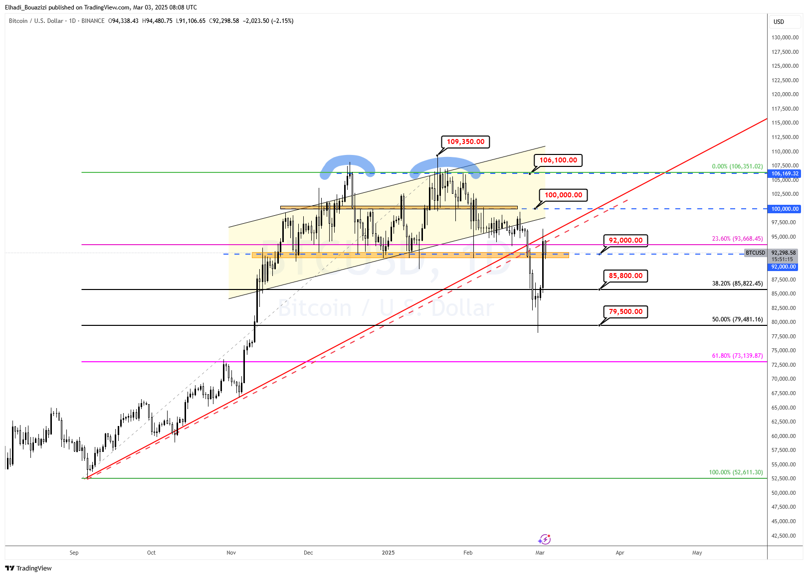 بالعودة إلى الرسم البياني، يجب أن نراقب كيف سيتفاعل سعر بيتكوين BTC مع منطقة الدعم 92,000 دولار. فالثبات فوقها، قد يعني المزيد من الصعود.
