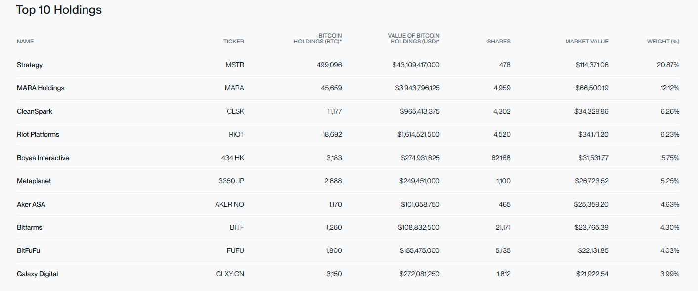 سيكون لدى ETF الجديد تمثيل مرجح لشركات تملك BTC. تنتمي أكبر حصة إلى الإستراتيجية (المعروفة سابقًا باسم MicroStrategy) ، مع 20 ٪ من وزن الصندوق.