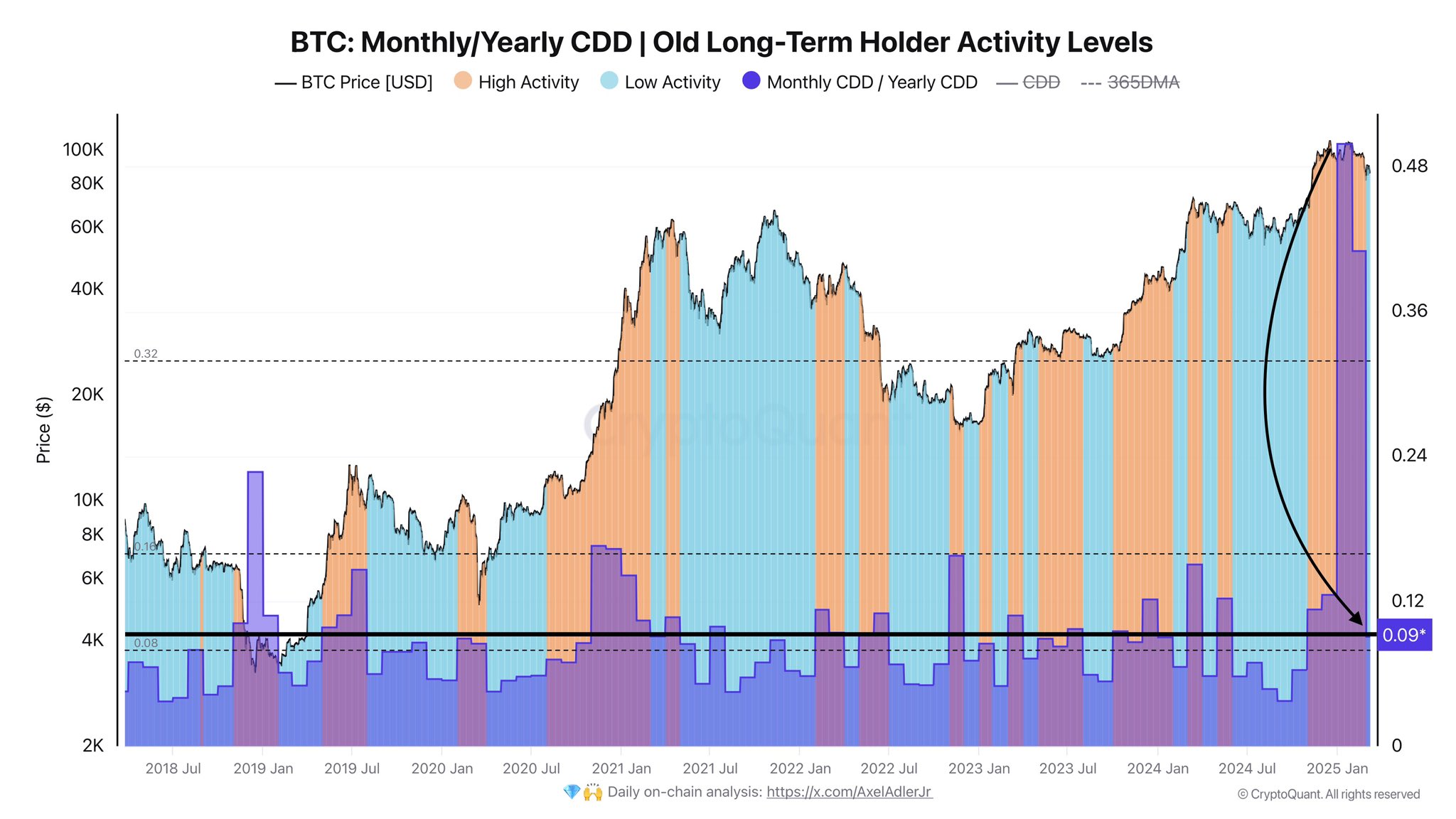 ومع ذلك، ليس الجميع متشائمين. لاحظ محلل على السلسلة – أكسل أدلر، أن أكبر توزيع للبيتكوين من قبل الحائزين على المدى الطويل في السنوات الأخيرة يبدو أنه انتهى.