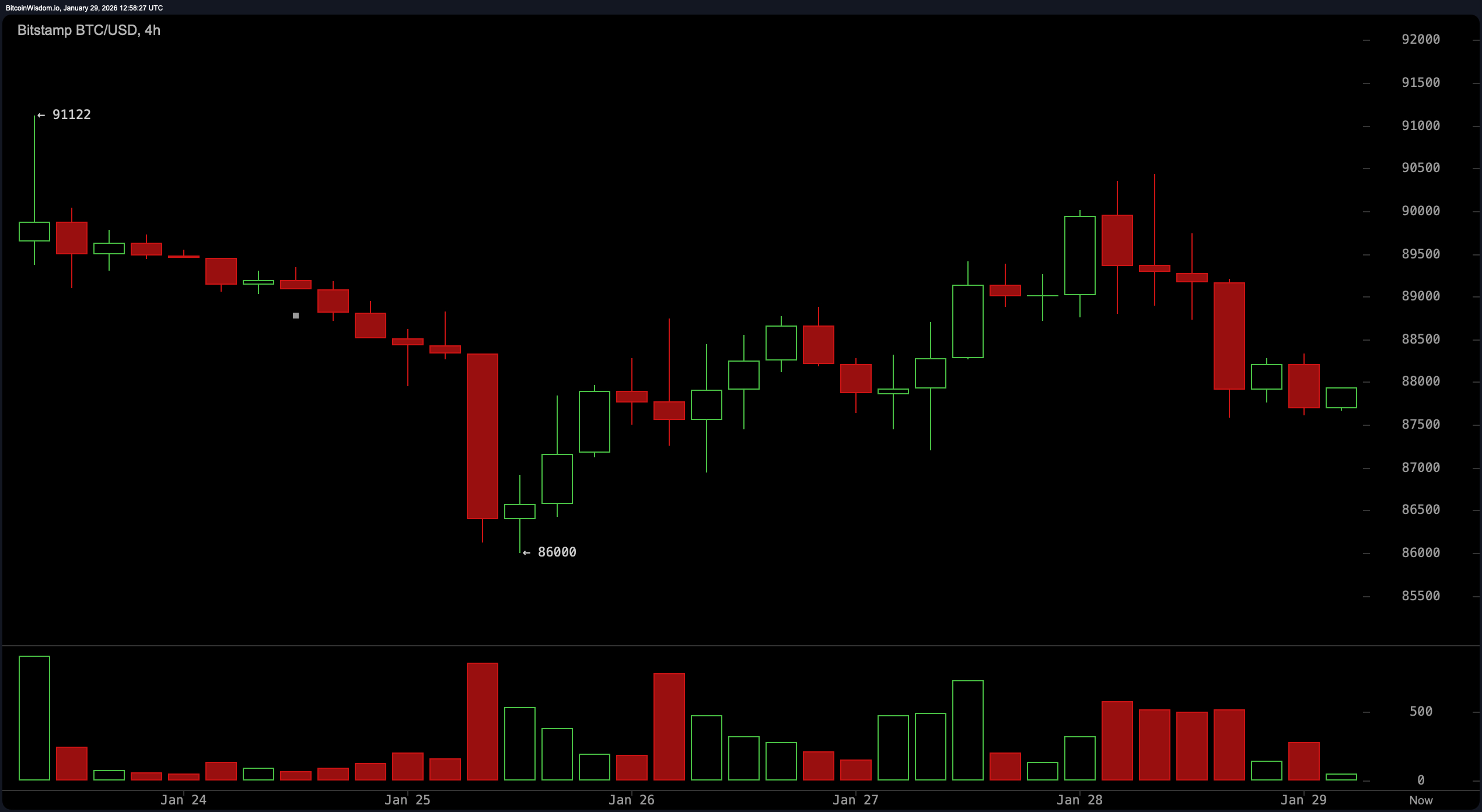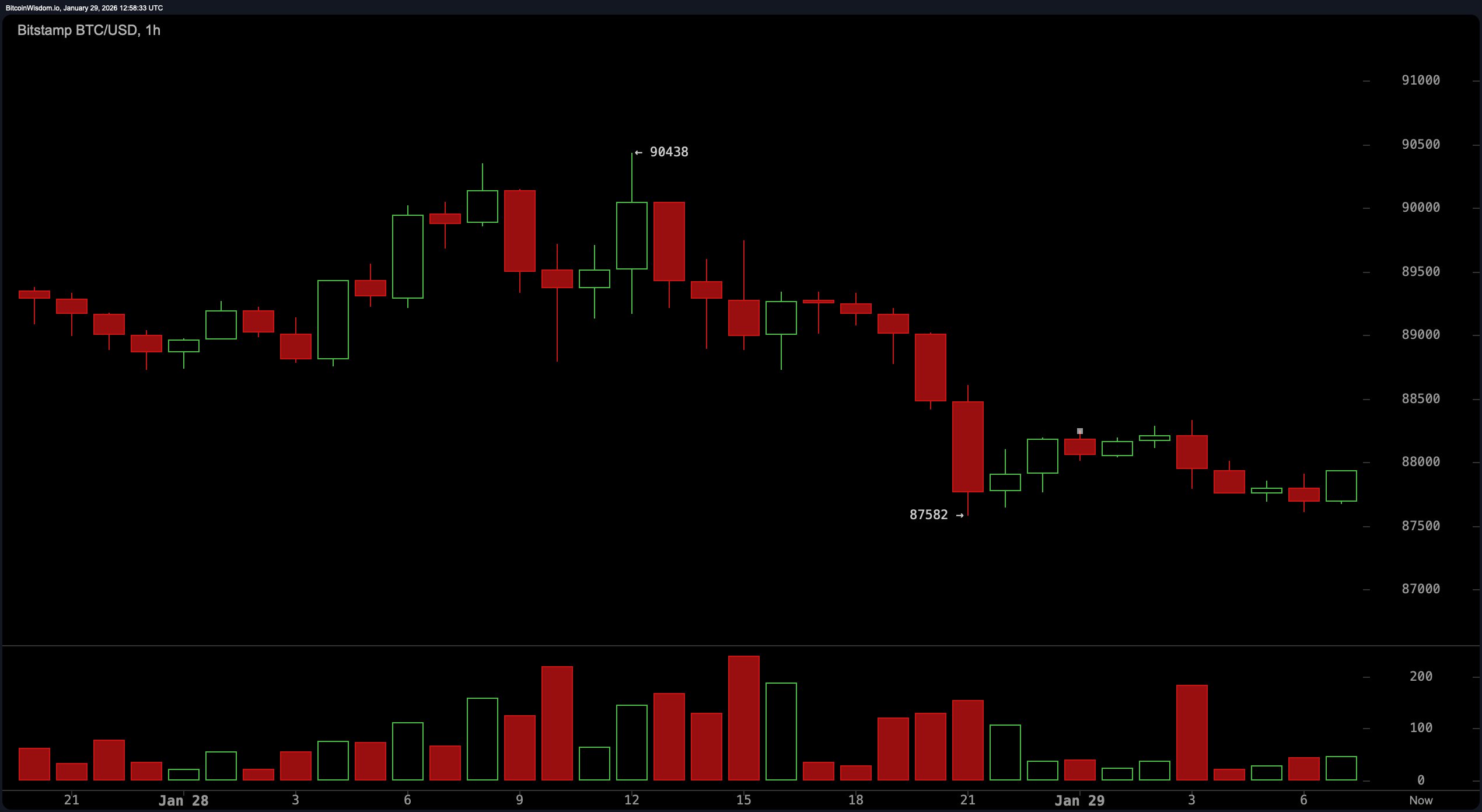 يعطي الرسم البياني لساعة واحدة قرارًا ملفوفًا في غلاف ضيق من التماسك. السعر يتجول بين $87,500 و $88,800، يغازل الدعم لكنه يرفض الالتزام بالاختراق. يُلمح وجود القيعان الأعلى الضعيفة إلى بعض الاهتمام الشرائي، لكنه بدون حركة قوية تتجاوز $89,500، يبدو الأمر كله كمصارعة مع الظل. بالمقابل، فإن اختراق تحت $87,300 من المحتمل أن يؤدي إلى إعادة زيارة لمستوى $86,000، والتوتر هنا ملموس—مثل اللحظة قبل ظهور الفلين.