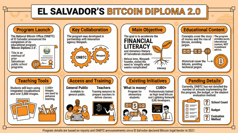 أعلن المكتب الوطني للبيتكوين في السلفادور أن هذا البرنامج التعليمي الجديد سيتم تطبيقه خلال الفترة الدراسية المقبلة. ويسعى البرنامج، الذي أُنتج بالشراكة مع Wespark، إلى شرح مفاهيم البيتكوين والنقود لطلاب المدارس الحكومية بطريقة بسيطة.