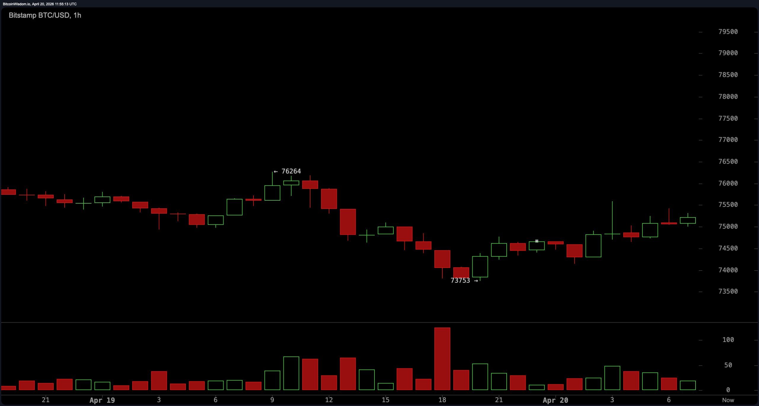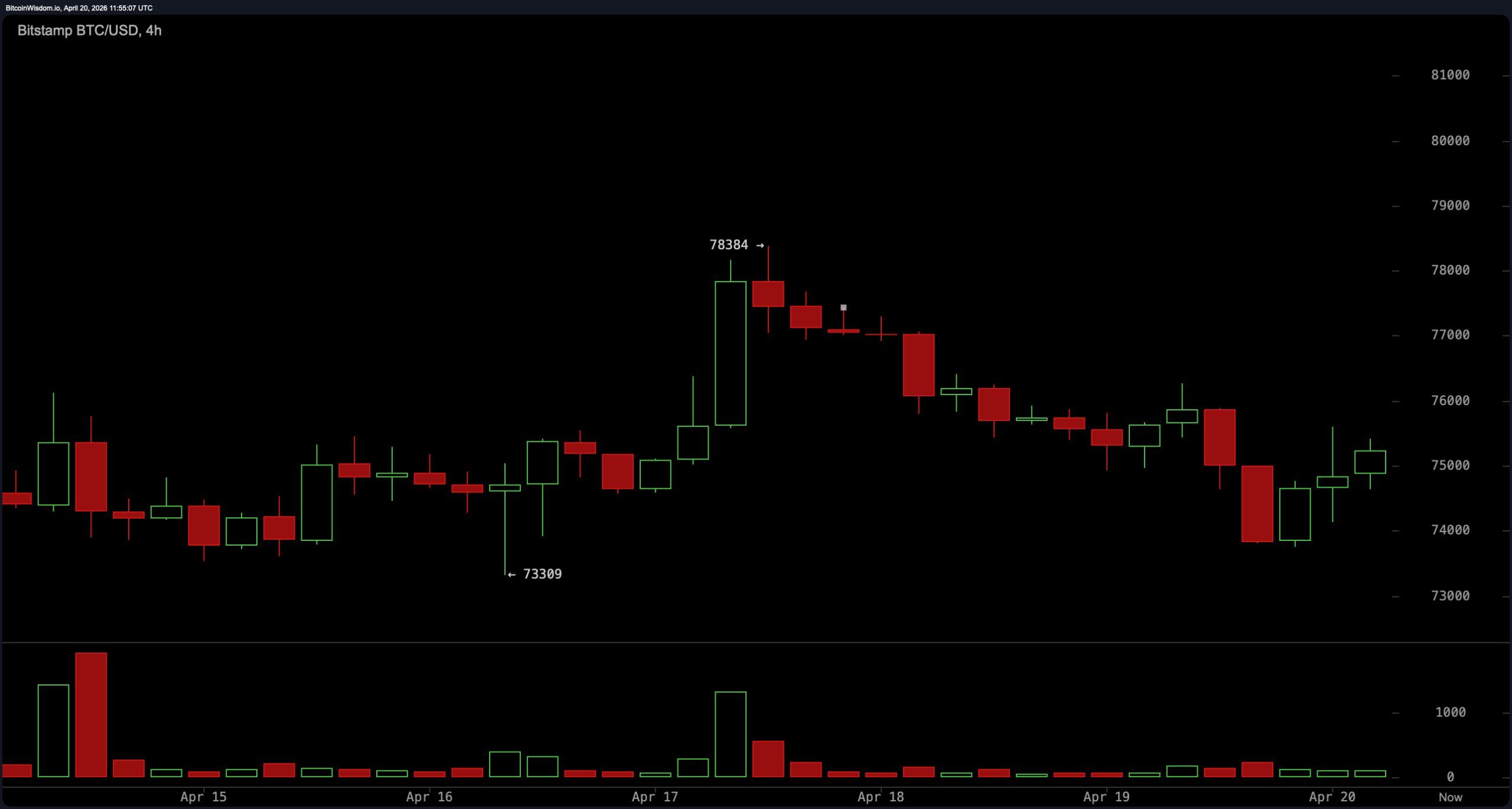 بلغ سعر البيتكوين 75,213 دولارًا في 20 أبريل 2026، في الساعة 8 صباحًا بتوقيت الساحل الشرقي للولايات المتحدة، حيث ظل السعر ضمن نطاق تماسك محدد في ظل استمرار هيكل صعودي أوسع نطاقًا. وتشير الإشارات الفنية عبر أطر زمنية متعددة إلى أن السوق يمر بمرحلة انتقالية، حيث يتوازن التردد قصير المدى مع اتجاه كلي لا يزال إيجابيًا.