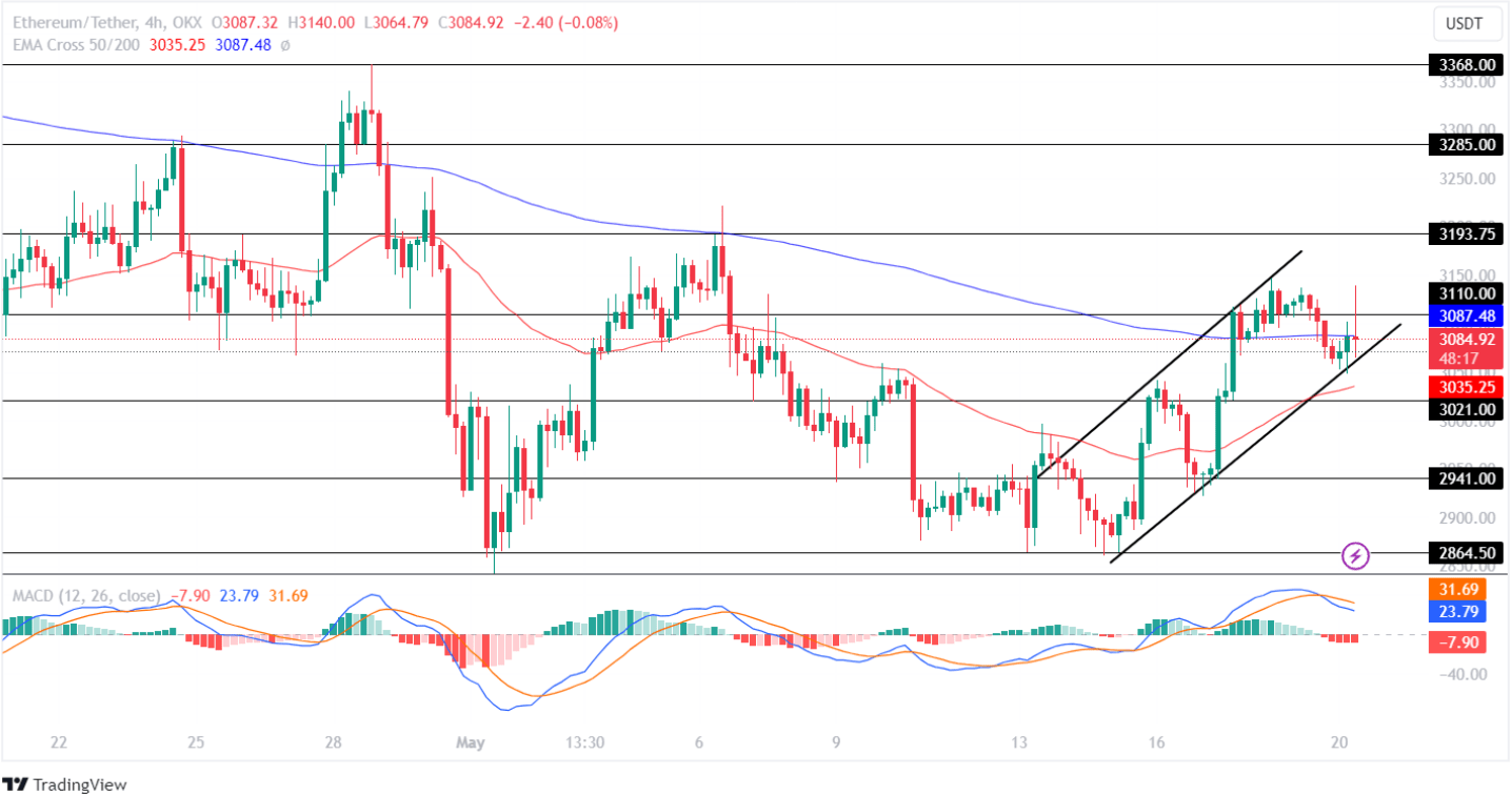 يواصل سعر $ETH، زعيم العملات البديلة، التداول ضمن نمط قناة صعودية، مما يشير إلى زيادة الشعور الصعودي للعملة المشفرة في السوق.