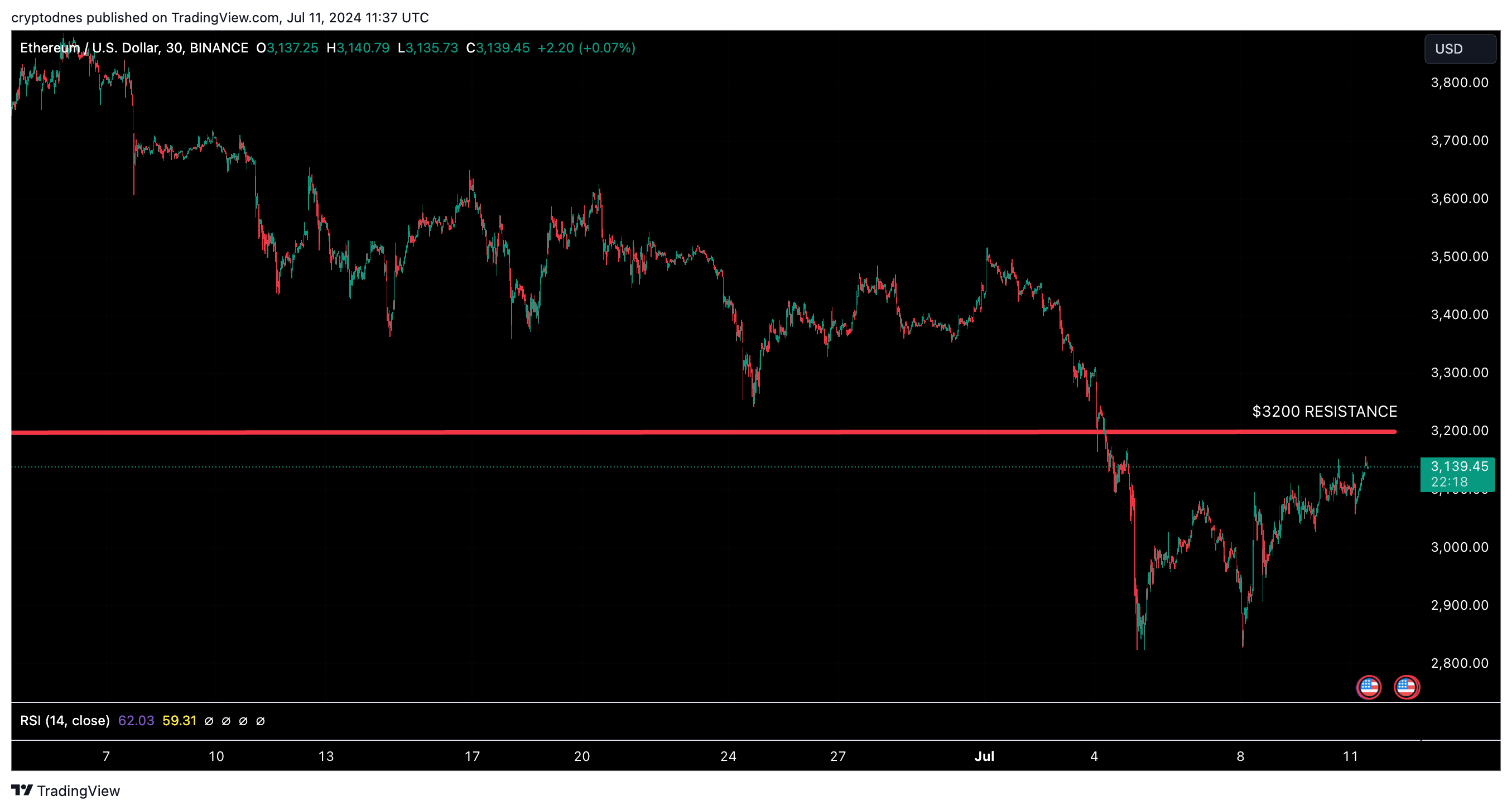 ومع ذلك، تواجه العملة المشفرة الآن عقبة كبيرة عند مستوى 3,200 دولار، مما قد يحدد اتجاه السعر على المدى القصير.