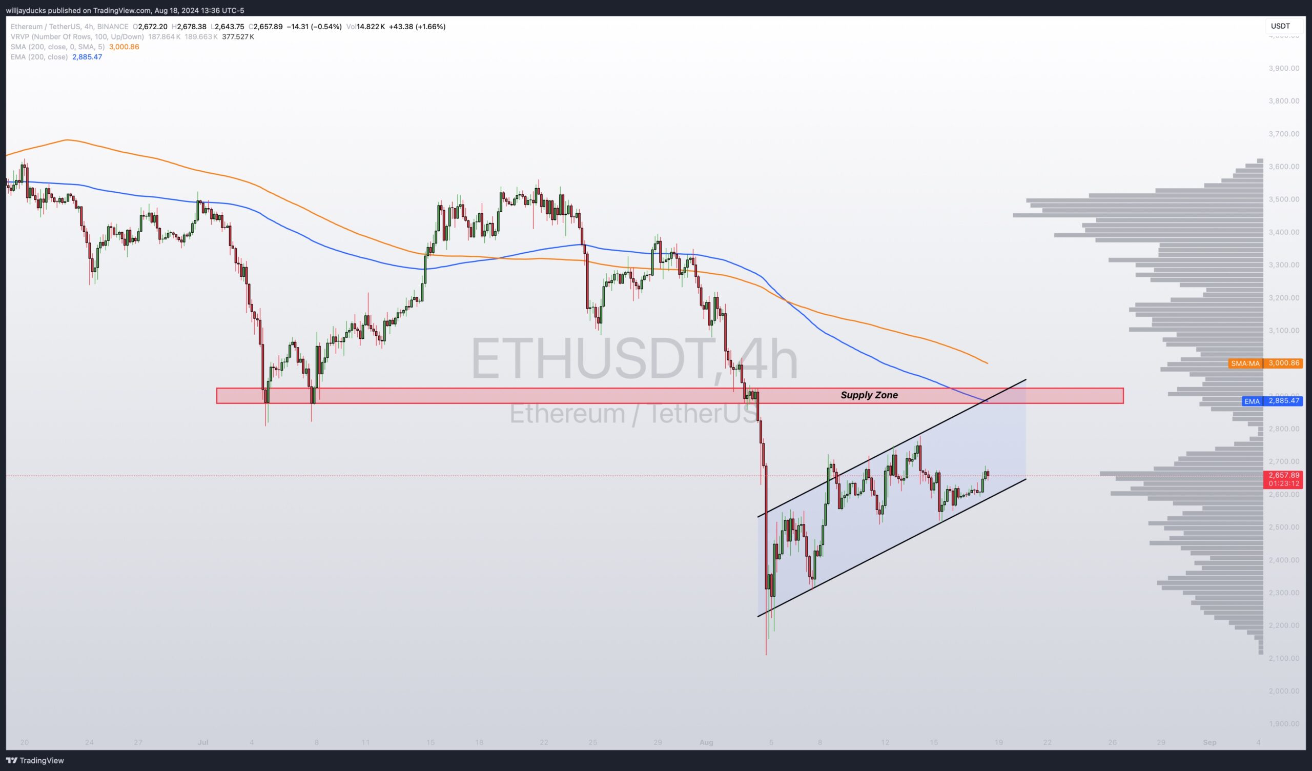 يظهر الرسم البياني أيضًا أن $ETH/$USDT قد كسر مؤخرًا المتوسط المتحرك الأسي لمدة 52 أسبوعًا، تاركًا وراءه ذيلًا طويلًا على الشمعة الأسبوعية - وهي علامة على اهتمام الشراء القوي. ويشير هذا إلى أنه على الرغم من انخفاض السعر الحالي، إلا أن هناك اهتمامًا كبيرًا وإمكانية التحرك نحو هدف 2,900 دولار.