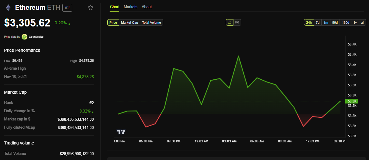 كان يتم تداول رمز إيثريوم $ETH عند ٣٬٣٠٥ دولار في وقت كتابة هذا التقرير، مما يمثل ارتفاعًا طفيفًا بنسبة ٠,٢٪ منذ افتتاح جلسة الأربعاء.