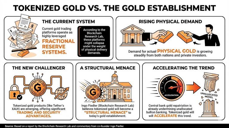 تقرير حديث من مختبر بحوث البلوك تشين، وهو منظمة غير ربحية ألمانية تبحث في استخدامات البلوك تشين لصالح المجتمع، قد تأمل في تأثير صعود الذهب المرموز على النظام الحالي.