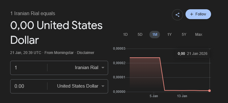 بحلول أوائل عام 2026، تدهور سعر الصرف إلى مستويات تم فيها محو القدرة الشرائية للريال عمليًا، مما زاد غضب الناس وأدى إلى حالة من الذعر في السوق.