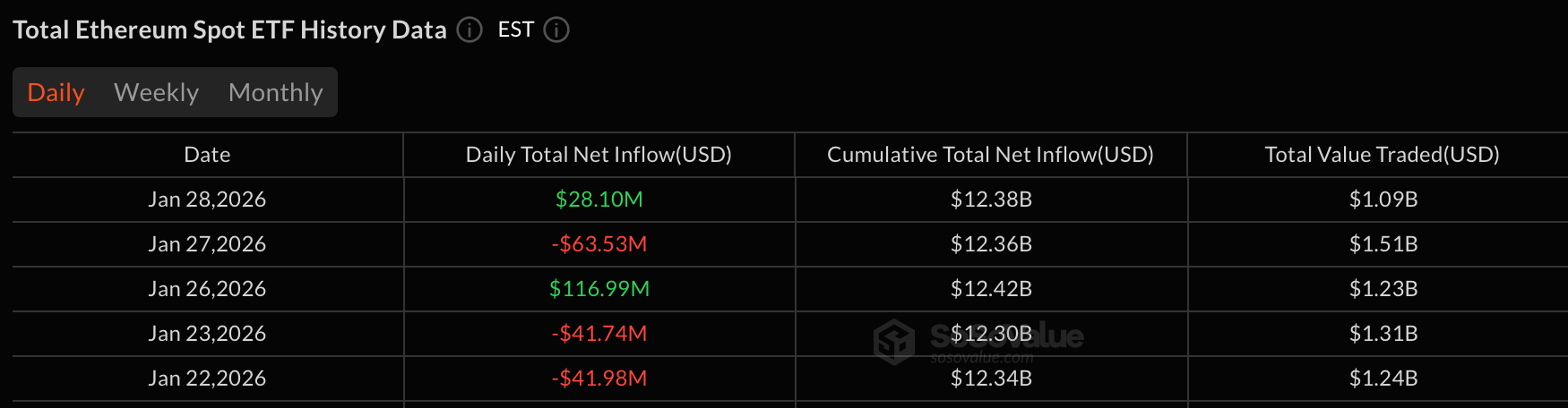 <ا href="https://buy.bitcoin.com/eth/">إيثر في صناديق الاستثمار المتداولة عاد مجددًا إلى المنطقة الإيجابية، مسجلًا دخولًا قدره 28.10 مليون دولار. قامت Blackrock’s ETHA ببذل الجهد الأكبر بمبلغ 27.34 مليون دولار في رأس المال الجديد، بينما أضافت Fidelity’s FETH مبلغًا أصغر قدره 752,000 دولار. ظل النشاط التجاري هادئًا عند 1.09 مليار دولار، وارتفعت صافي الأصول إلى 18.22 مليار دولار.