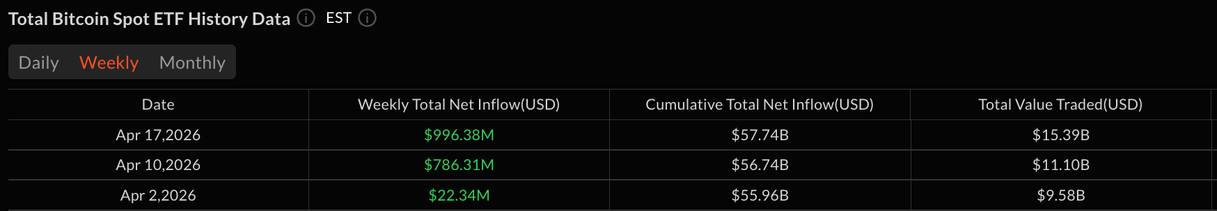 - استقطبت صناديق الاستثمار المتداولة في البيتكوين 996.38 مليون دولار بين 13 و17 أبريل، بقيادة صندوق IBIT التابع لشركة Blackrock الذي سجل تدفقات بقيمة 906.1 مليون دولار.