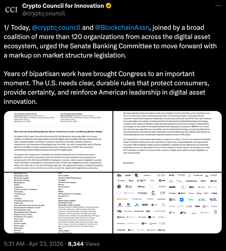 وفي رسالة يوم الخميس إلى قادة لجنة الشؤون المصرفية في مجلس الشيوخ الأمريكي، قالت كل من مجلس العملات المشفرة للابتكار وجمعية البلوك تشين إن اللجنة يجب أن “تمضي نحو مناقشة مشروع قانون CLARITY Act وتعديله، من أجل توفير إطار فيدرالي شامل لهيكل سوق الأصول الرقمية.”