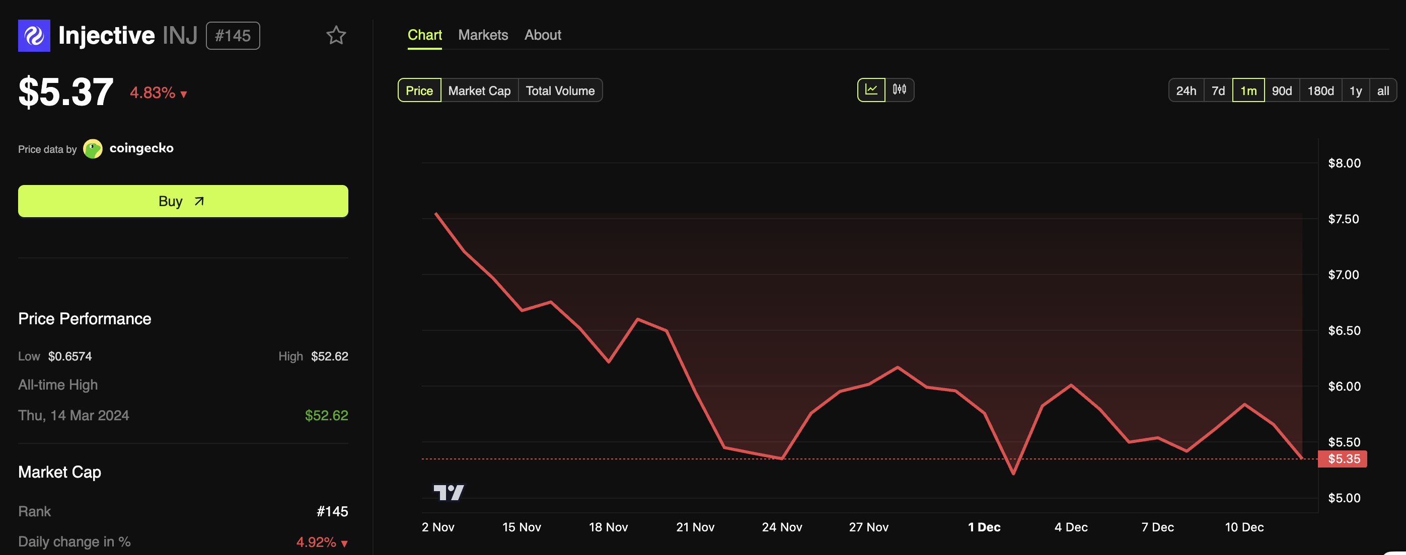 Trotzdem hat sich das bisher nicht in einem stärkeren Bitcoin-Kurs für INJ gezeigt. Laut BeInCrypto Markets ist der Kurs von INJ im letzten Monat um 30,1 Prozent gefallen und liegt hinter dem allgemeinen Kryptomarkt.