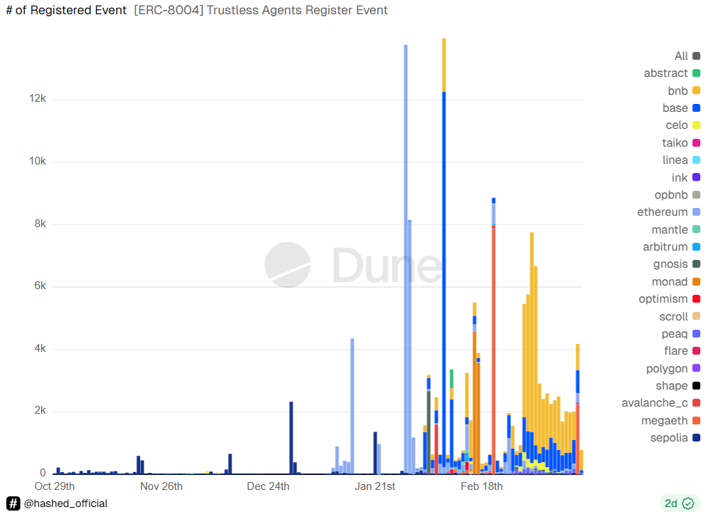 $BNB Chain verzeichnet 44.051 Agenten , gefolgt von 36.512 auf Ethereum . Die Agenten haben sich im EVM-kompatiblen Ökosystem auf ältere L1- und L3-Chains ausgebreitet. Der ERC-8004-Standard verknüpft einen Agenten mit einem Non-Fungible Token (NFT), wodurch seine Aktivitäten trac sind und ein transparenter Reputationswert hinzugefügt wird.