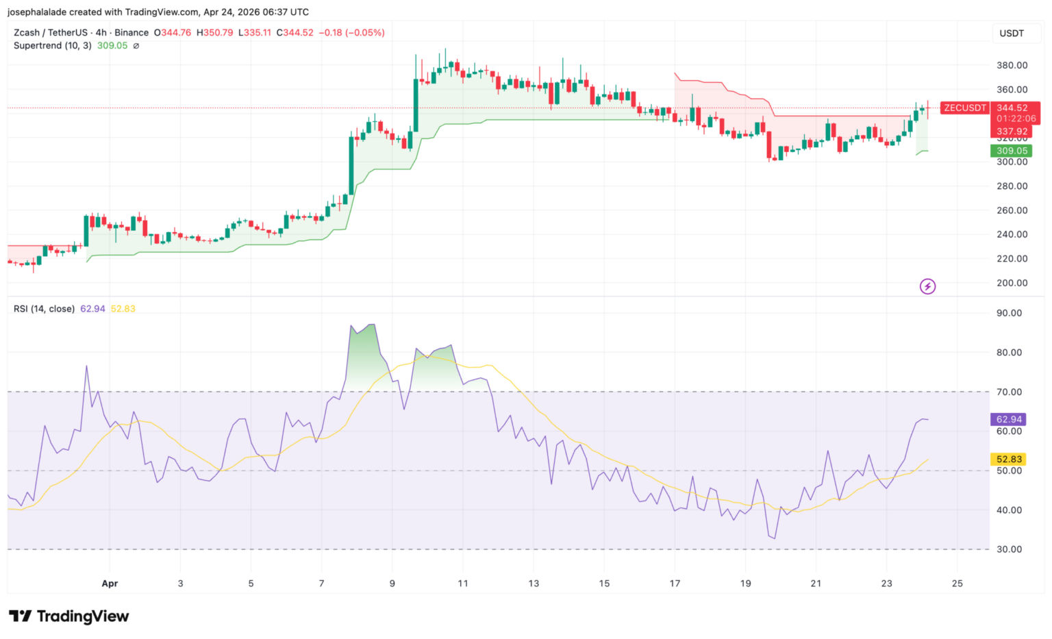 Auf dem 4-Stunden-Chart hat sich die Kursstruktur von Zcash eindeutig bullisch entwickelt. Der Supertrend-Indikator (10, 3) ist auf Grün umgeschlagen und hält derzeit bei 309,05 $, deutlich unter dem aktuellen Kurs. Das bedeutet, dass das Trendsignal auch bei kleineren Rückgängen gültig bleiben kann. Dieses Niveau entspricht in etwa den Tiefstständen vom 19. bis 20. April, als Käufer eingriffen, um einen starken mehrtägigen Rückgang umzukehren.