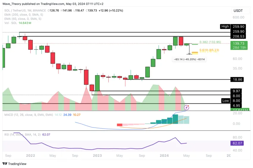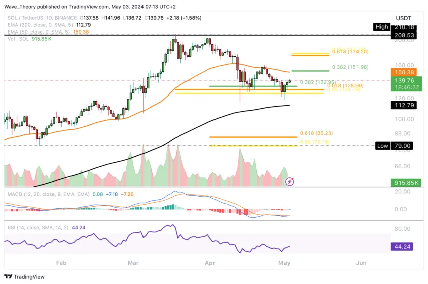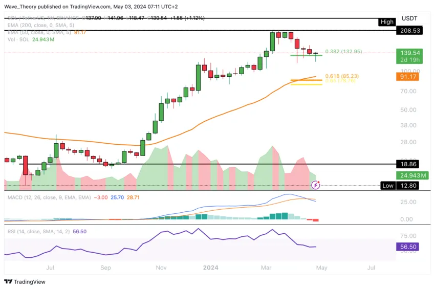 Dort findet der SOL Kurs Unterstützung, bevor er zur Golden Ratio zwischen rund 79 USD und 85 USD zurückkehren könnte. Solana kann sich aber seit vier Wochen über der 0,382 Fib Unterstützung bei rund 133 USD halten.