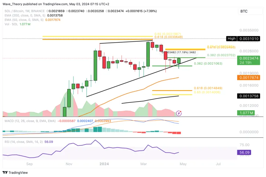 Gegen Bitcoin konnte Solana in dieser Woche an der Fib Unterstützung bei rund 0,0021 BTC bullisch abprallen. Solana konnte binnen dieser Woche bereits rund 17,2 % steigen.