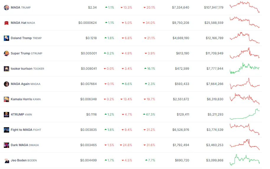 Die fünf beliebtesten Kandidaten — MAGA (TRUMP), MAGA Hat (MAGA), Doland Tremp (TREMP), Jeo Boden (BODEN) und Kamala Horris (KAMA) — handeln jetzt fast 90 Prozent unter ihrer Spitzenmarktkapitalisierung.