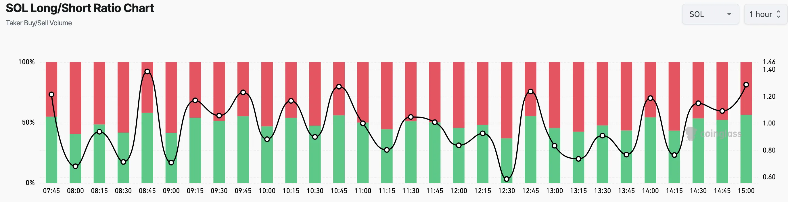 Laut Coinglass liegt das Solana Long/Short-Verhältnis bei 1,14. Wie der Name schon sagt, dient das Long/Short-Verhältnis als Barometer für die Erwartungen der Marktteilnehmer. Liegt das Verhältnis unter 1, gibt es mehr Short- als Long-Positionen auf dem Markt.
