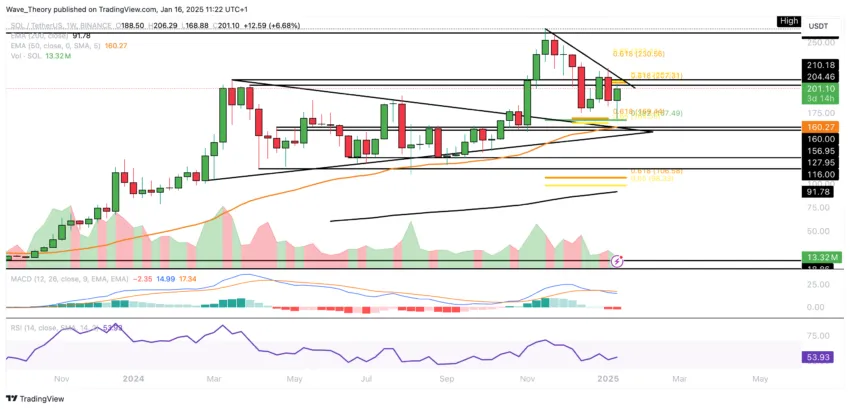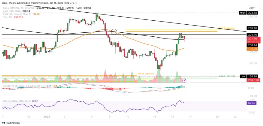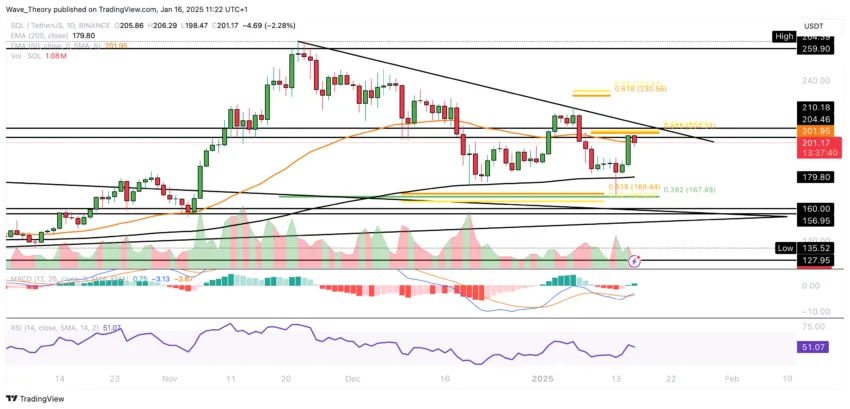 Anschließend initiierte Solana eine starke Aufwärtsbewegung, bei dem er den 50-Tage-EMA bei rund 201 USD überwinden konnte. Doch am Golden Ratio Widerstand bei rund 210 SUD scheint Solana jetzt auf bärische Ablehnung zu stoßen.