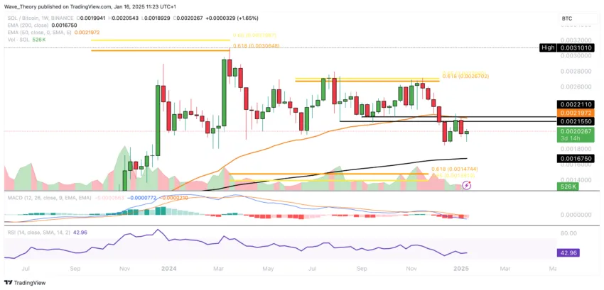 Gegen Bitcoin ist Solana vorletzte Woche am 50-Wochen-EMA bei rund 0,0021972 BTC gescheitert. Dort liegt nach wie vor wichtiger Widerstand auf den SOL Kurs.