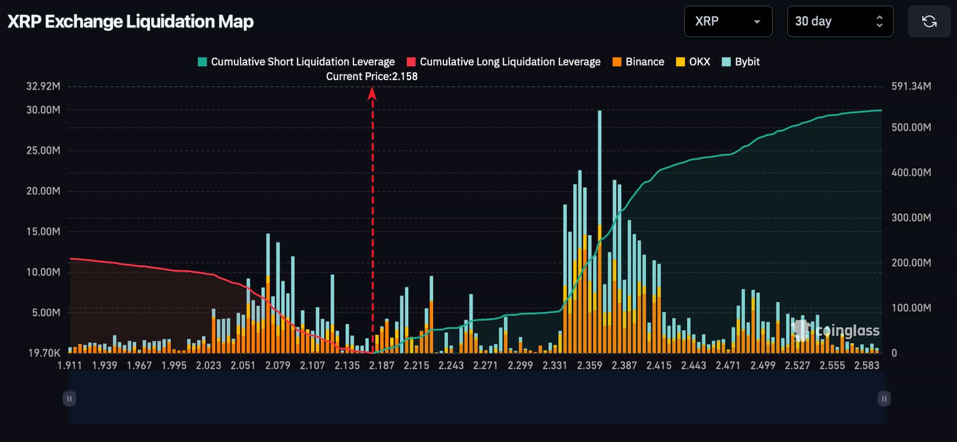 Der $XRP-Kurs hatte in letzter Zeit zu kämpfen und steht derzeit bei 2,15 Dollar. Doch es scheint, dass sich das bald ändern wird. Neue Daten von Coinglass deuten auf eine mögliche short squeeze hin, die jederzeit ausbrechen könnte. Wenn $XRP über 2,35 Dollar steigt, drohen mehr als 500 Millionen Dollar an Short-Positionen liquidiert zu werden.