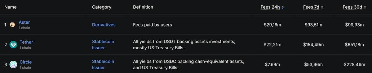 Auch die Stablecoin-Giganten Tether und Circle liess Aster deutlich hinter sich zurück. Tether nahm 22 Millionen US-Dollar, Circle acht Millionen US-Dollar ein. Die enormen Einnahmen gelingen Aster allein über die Handelsgebühren, die mit 0,03 bis 0,08 Prozent gering ausfallen.