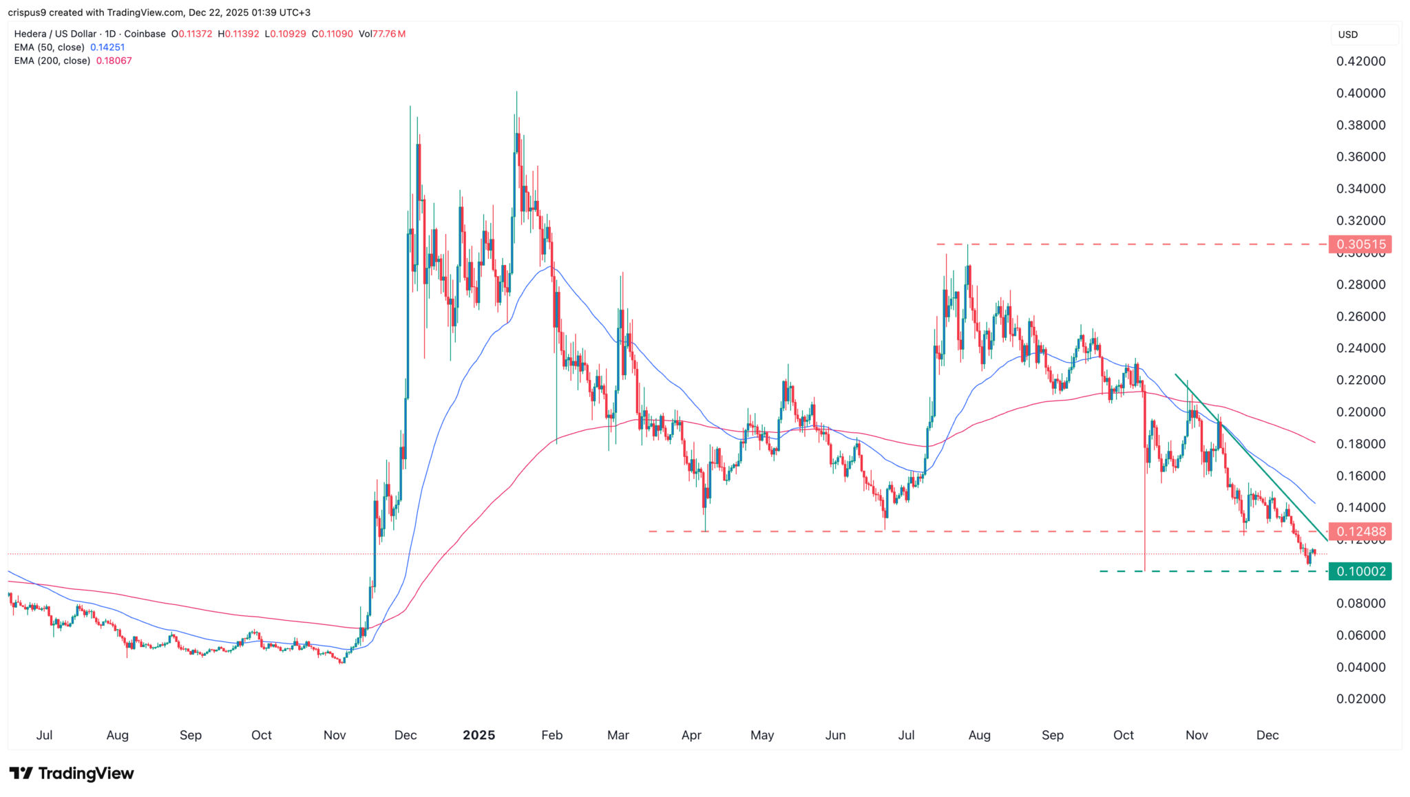 Hedera-Kurs-Chart | Quelle: TradingViewDer Tageszeitrahmen-Chart zeigt, dass HBAR in den letzten Monaten abgestürzt ist. Er ist von einem Höchststand von 0,3051 $ am 27. Juli auf aktuell 0,1100 $ abgestürzt.