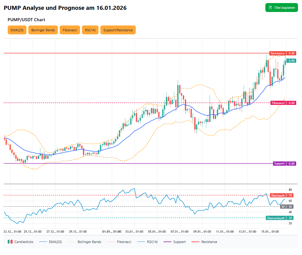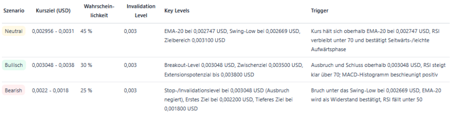 Die kurzfristige Prognose am 16.01.2026 ist neutral bis leicht bullisch: der Kurs handelt über dem EMA‑20 und das Momentum ist positiv, aber die Volatilität ist erhöht. Unterstützungen liegen bei 0,002747 USD (EMA‑20) und 0,002669 USD (letztes Swing‑Low). Widerstände sind das Intraday‑Hoch bei 0,003048 USD und das kurzfristige Zielcluster um 0,003800 USD. Ein klarer Ausbruch über 0,003048 USD würde weiteres Momentum freisetzen, während ein Bruch unter 0,002669 USD kurzfristig Gewinnmitnahmen und erhöhte Volatilität auslösen dürfte.