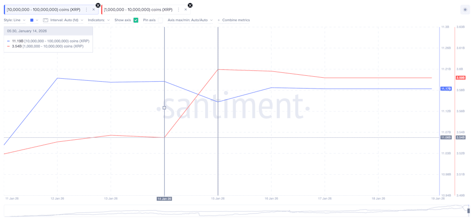 On-Chain-Daten zeigen auffällige Bewegungen bei größeren Krypto Wallets. Whales mit Beständen zwischen 10 und 100 Millionen XRP erhöhten ihre Positionen zuletzt um mehrere zehn Millionen Token. Kleinere Großanleger mit 1 bis 10 Millionen XRP waren sogar noch aktiver und stockten ihre Bestände bereits vor dem jüngsten Kursrückgang auf.