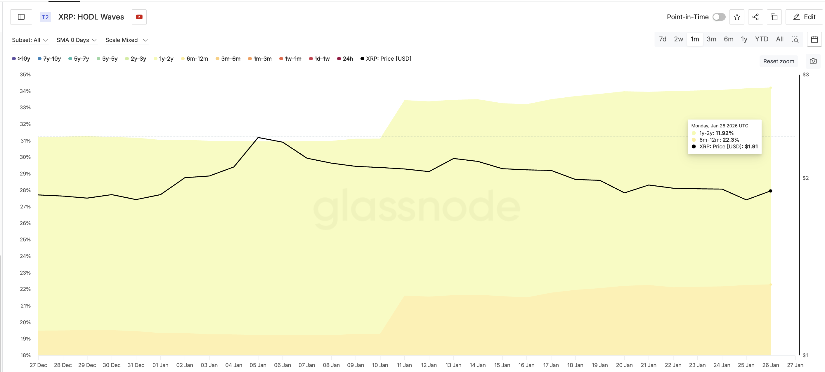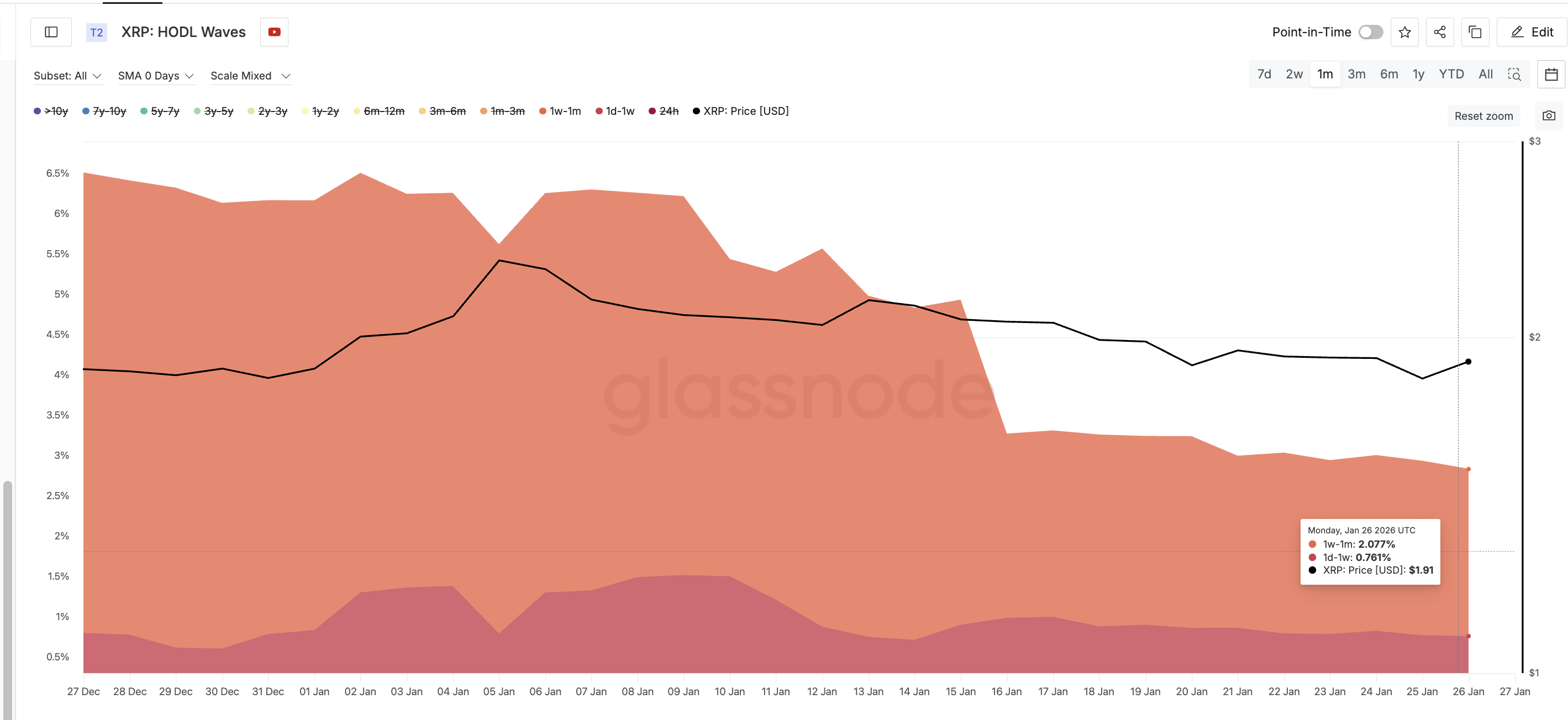 Eine der deutlichsten Veränderungen sieht man in den sogenannten HODL-Wellen von $XRP. Die HODL Waves zeigen an, wie lange Coins gehalten werden. Dadurch kann man kurzfristige Trader und Halter mit Überzeugung besser unterscheiden.