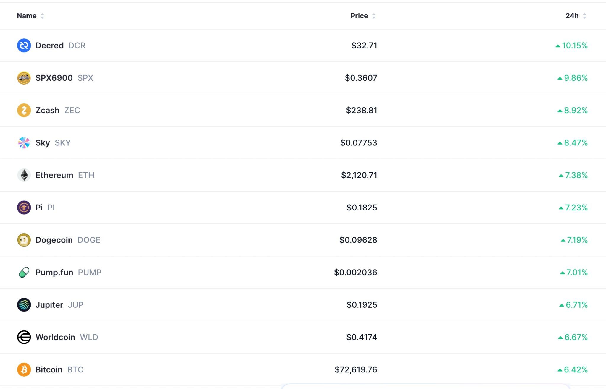 Die größten Gewinner in der Krypto-Branche waren Token wie Decred, SPX6900, Zcash, Dogecoin und Pi Network, die alle in den letzten 24 Stunden um über 7 % gestiegen sind.