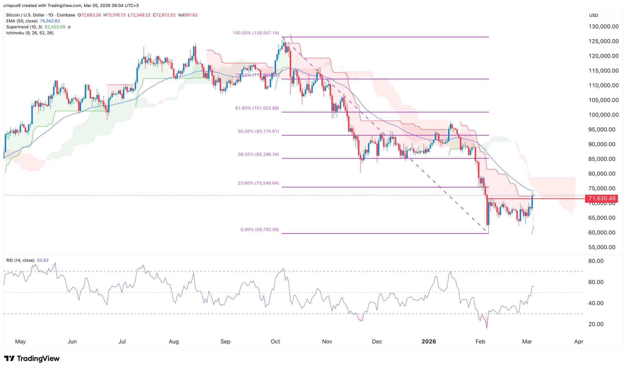Der Bitcoin-Kurs ist am Mittwoch auf 74.000 US-Dollar gestiegen, weil Investoren auf risikoreiche Anlagen umgestiegen sind, was Hoffnungen auf einen neuen Krypto-Boom geweckt hat. Ethereum ist über 2.200 US-Dollar geklettert, während die Marktkapitalisierung aller Coins in den letzten 24 Stunden um über 5 % auf über 2,46 Billionen US-Dollar gestiegen ist.