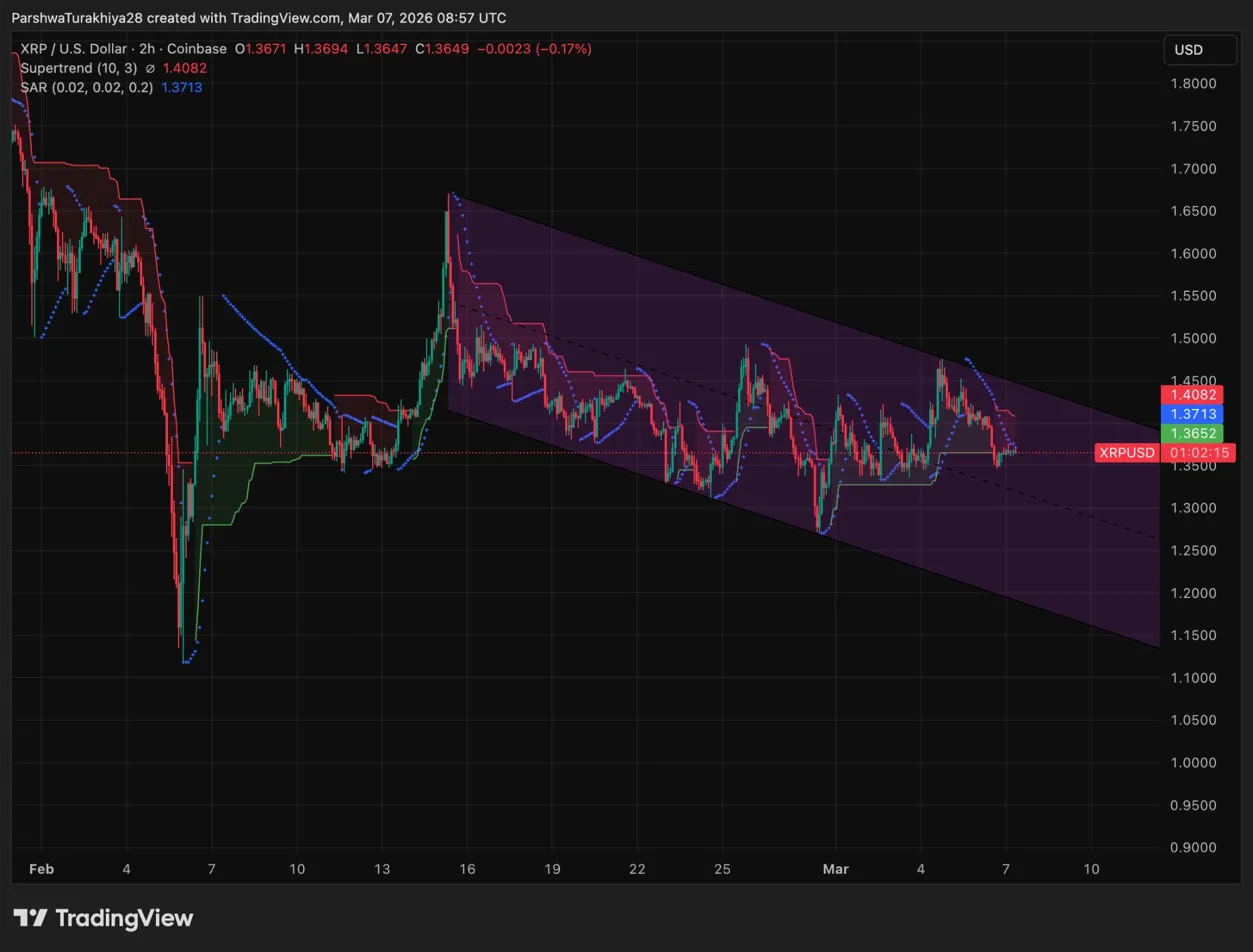 - Bullischer Fall: $XRP hält 1,35 $ und bricht über den absteigenden Kanal bei 1,40 $ bis 1,42 $ aus. Das macht die bärische Struktur ungültig und zielt den Supertrend auf 1,4082 $ und potenziell 1,56 bis 1,60 $ an.