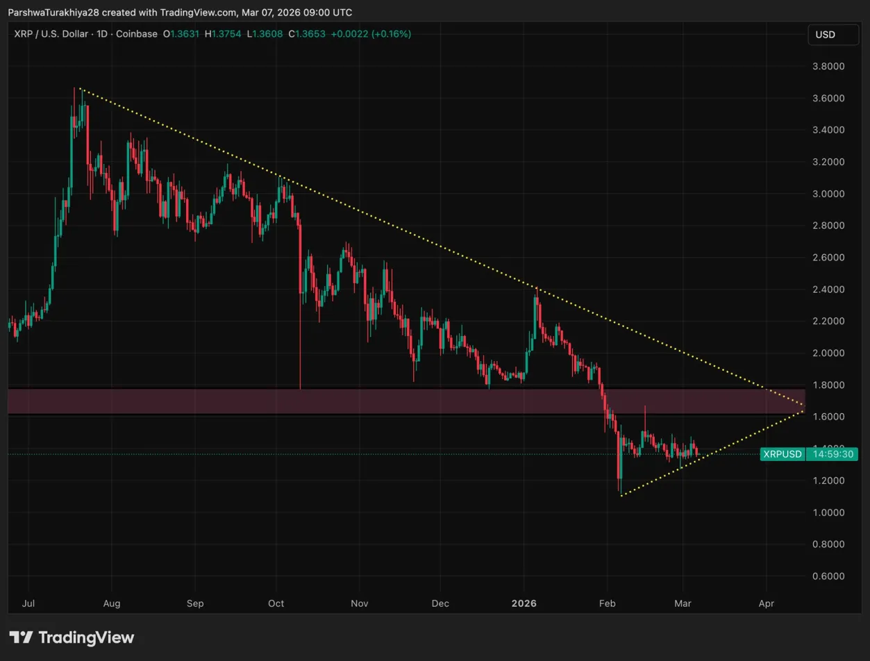 Der $XRP-Preis handelt heute nahe 1,3649 $, ein Rückgang von 0,17 % nach einer Konsolidierung innerhalb eines absteigenden Kanals, der seit Mitte Februar den Kurs nach unten geführt hat. Diese Maßnahme bringt Käufer und Verkäufer ins Gleichgewicht, da ETF-Abflüsse verlängern und Derivate Kontrakte positionieren.